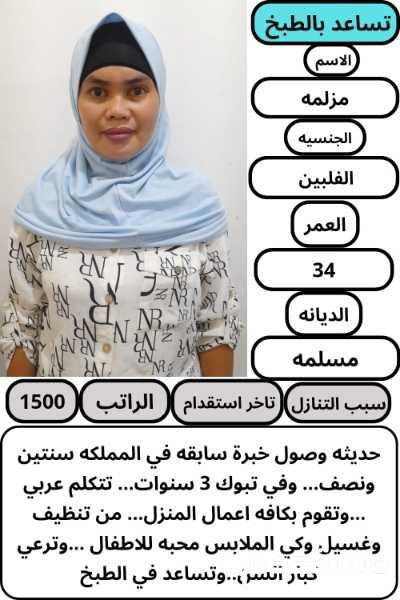 متوفر عماله منزليه وطباخات ومرافقين لكبار السن وعاملات نظافه ومربيات اطفال وكوافيرات وسائقين ومتاح التجربه لكل أنحاء المملكه والتجربة خير برهان