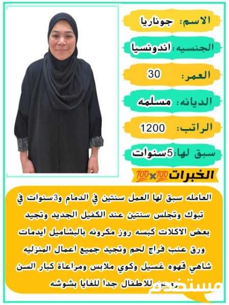 ????العامله سبق لها العمل سنتين في الدمام و 3 سنوات في تبوك وتجلس سنتين عند الكفيل الجديد ????????????وتجيد بعض الاكلات كبسه روز مكرونه بالبشاميل ايدمات ورق عنب فراج لحم وتجيد جميع اعمال المنزليه شاهي قهوه ????????غسيل وكوي ملابس ????????????ومراعاة كبار السن ومحبه للاطفال جدا للغايا بشوشه